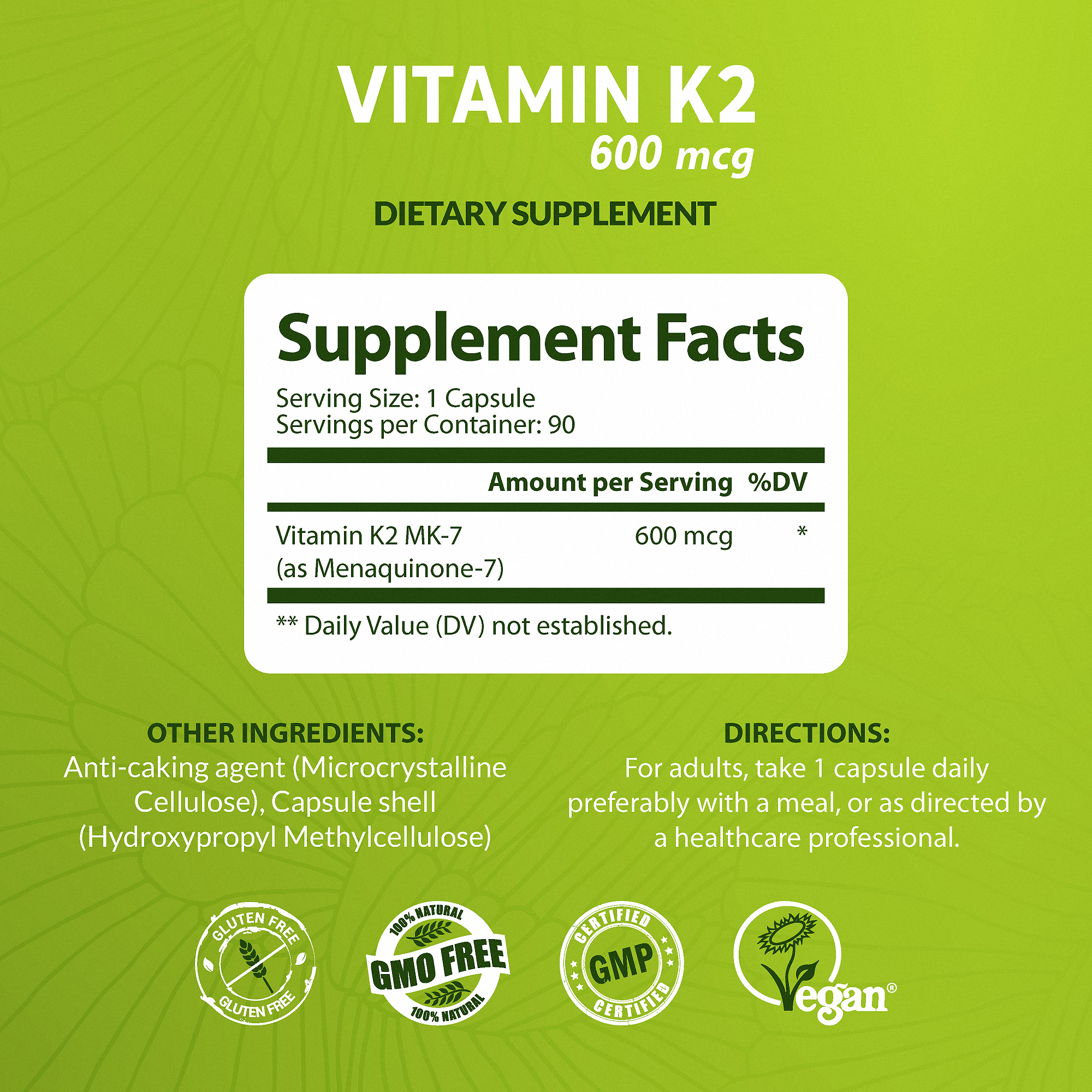 Harnessing the power of high-strength Vitamin K2, each dose of 600 mcg delivers a potent boost to your bone health, cardiovascular function, and overall vitality, empowering you to lead a healthier and more vibrant life.