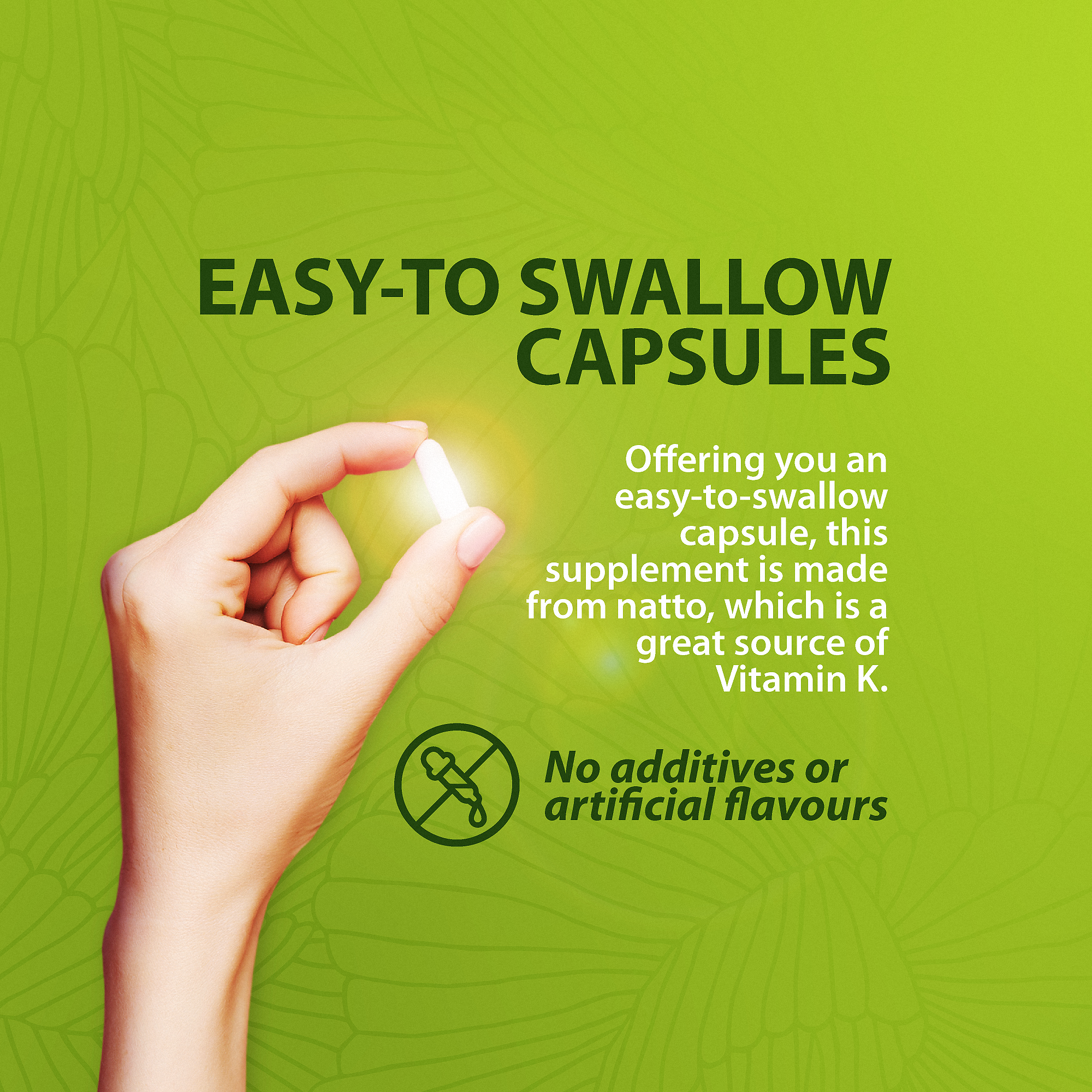 Crafted with convenience, our Vitamin MK7 supplement is available in an easy-to-swallow capsule, with serving recommendation of only 1 capsule per day.